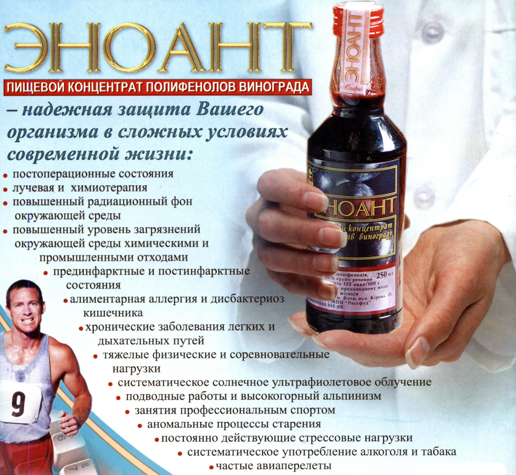 "Эноант" - без алкоголя. Содержит в себе всю гамму полифенолов и все микроэлементы красного винограда "Каберне-Совиньон", поэтому он эффективнее столовых красных вин как продукт функционального питания.
