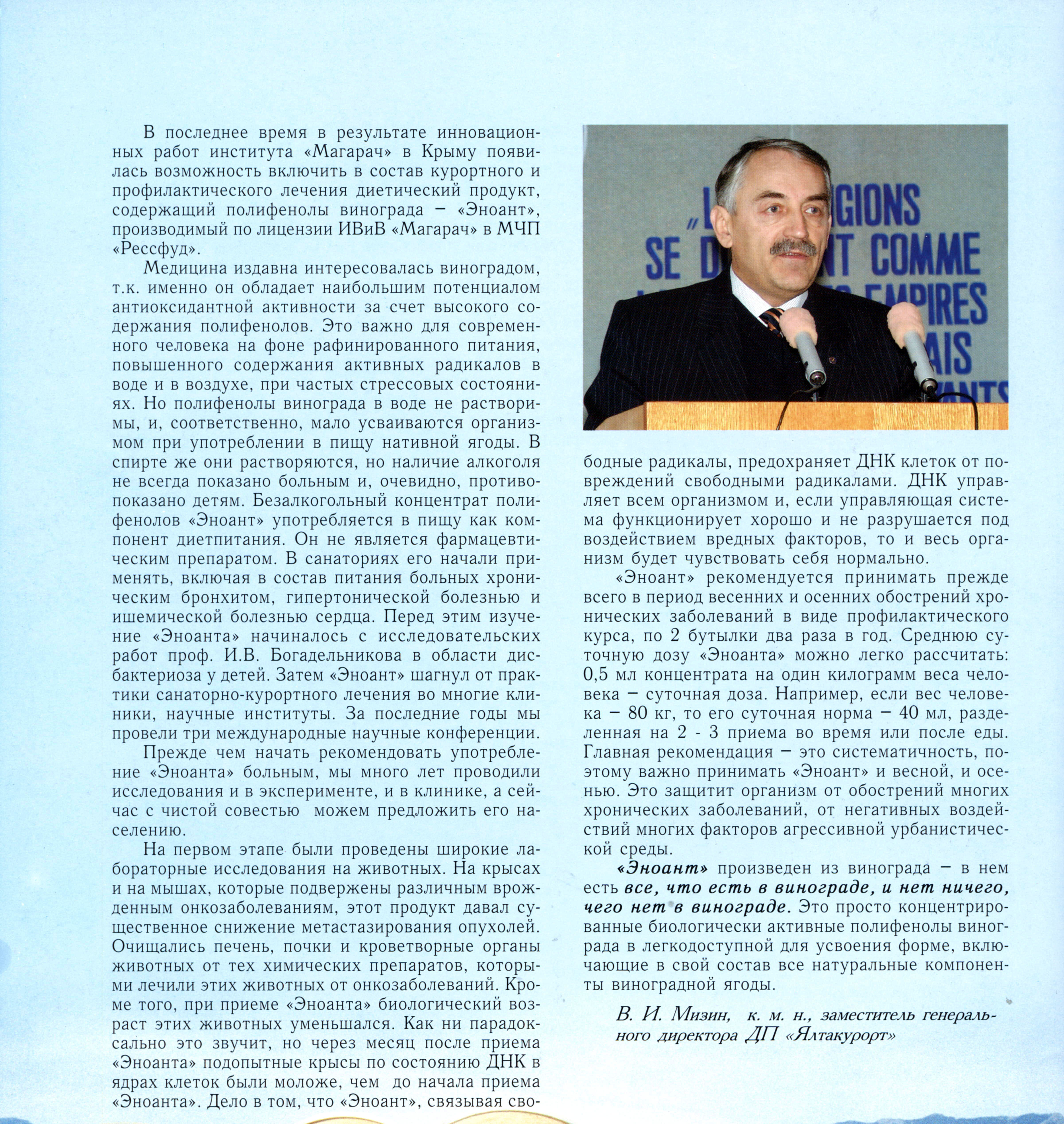 уникальные биологические свойства "Эноанта" (регуляция антиоксидантного баланса, нормализация микрофлоры кишечника, регуляция всасывания и расщепления питательных веществ и коррекция иммунитета) позволяет использовать его в качестве перспективного для Украины продукта функционального питания, способствующего сохранению и восстановлению здоровья.